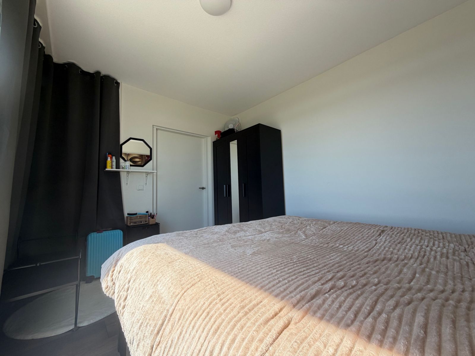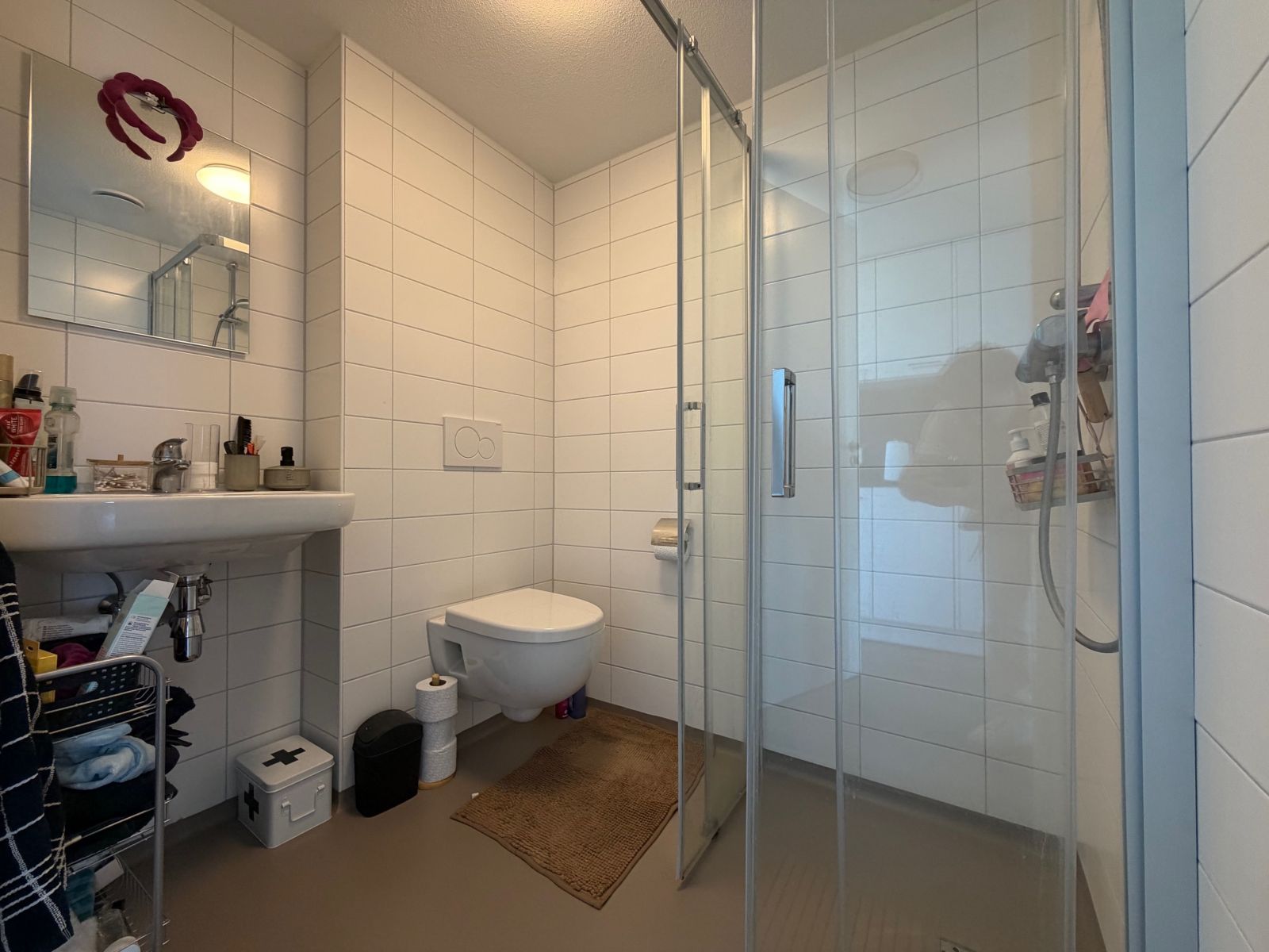 De slaapkamer is via de woonkamer bereikbaar. De badkamer is compleet uitgerust met een douche, wastafel en toilet.