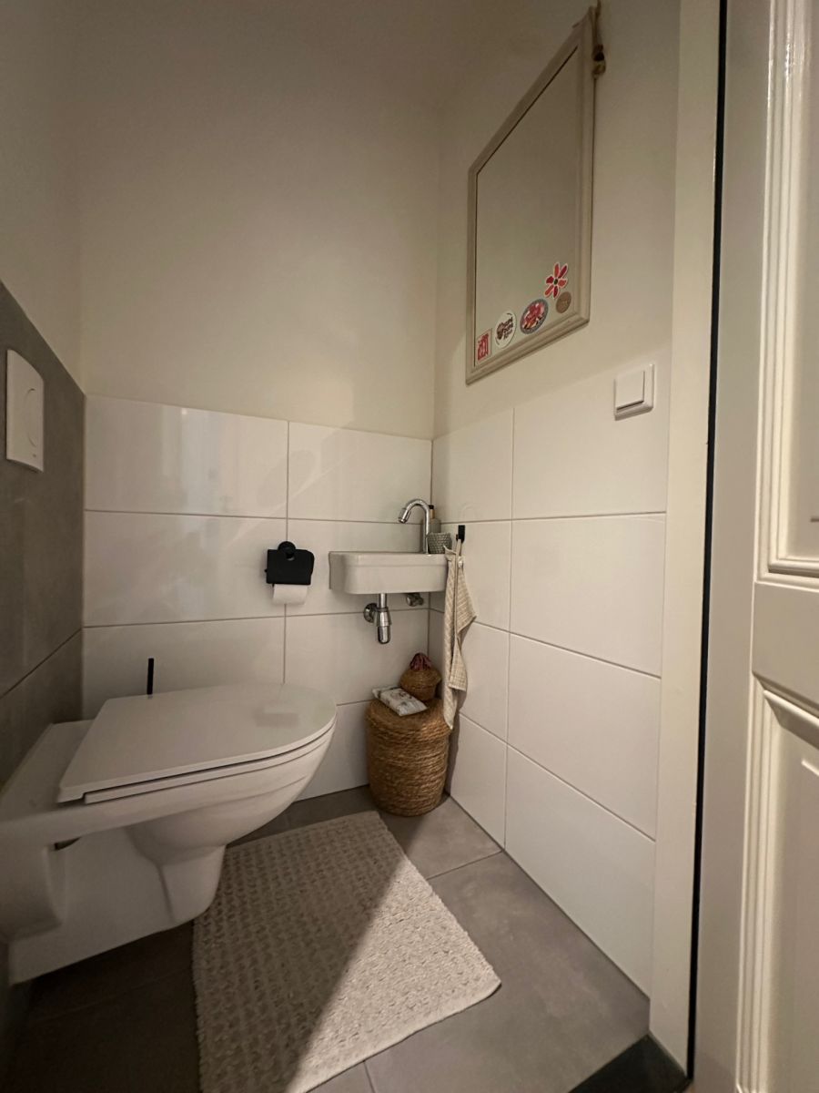 De badkamer bestaat uit een inloop regendouche, wastafelmeubel en een wasmachine aansluiting.
