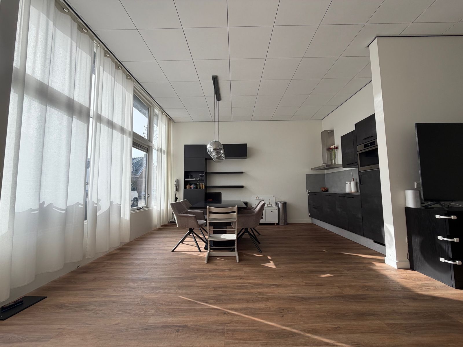 Je betreedt het appartement direct in de ruime woonkamer met open keuken en veel lichtinval. De keuken is voorzien van luxe inbouwapparatuur, waaronder een inductiekookplaat, vaatwasser, combi-oven en een koelkast met vriesvak.